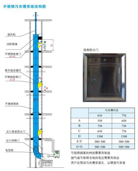 污衣井是采用進口優質不銹鋼加工焊接而成。槽管以角形圓環接口結合,允許各層樓的槽管在高度上的尺寸和冷縮熱脹的情況。在每一層樓,槽管以鍍鋅鐵地臺固定架支承,并用螺栓錨固于地臺上。污衣井在所需的樓層提供的投物門為側鉸、雙層門,可以加配電控門鎖,也可以人手操作。