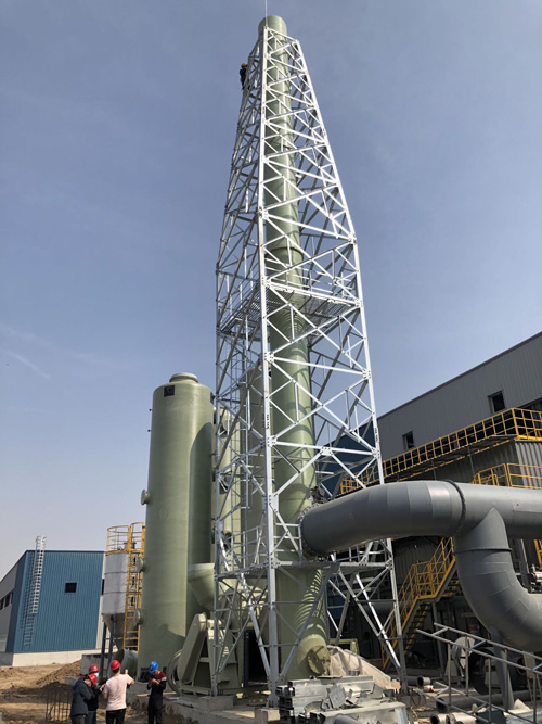 玻璃鋼煙囪:玻璃鋼煙囪采用玻璃鋼為材質制造,成品具有造價低,制作周期短,使命長,加工方便,安裝簡單,質量輕,強度,剛度高,采用玻璃鋼制造內外表面光滑,抗老化性能、在高溫下內腐蝕性能優良等特點,而且可以方便的增加噴淋器、過濾網等以吸收煙氣中的有害成分。我們已經摸索出一套成熟的、可靠的生產和安裝工藝以確保煙囪的安裝精度。玻璃鋼煙囪現廣泛應用在電力、化肥、化工、冶煉、石油等行業,作為腐蝕性或高溫煙氣的處理設備。